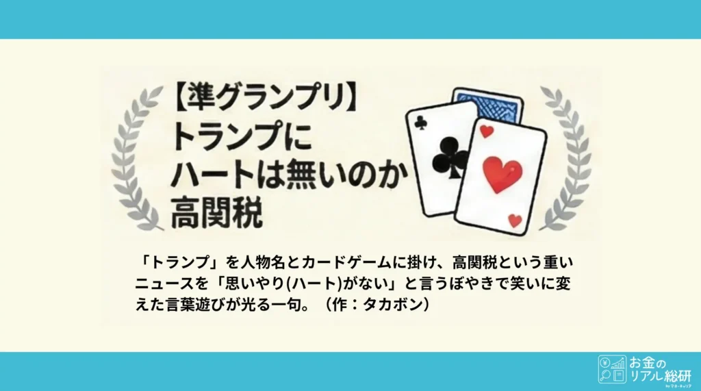 復権したトランプ政権の「高関税」政策を「心がない“ハートの無さ”」と「トランプの記号のハートが無い」をかけた秀逸な一作。政治・経済ニュースを身近な言葉に落とし込んだ表現力があり、時代性の象徴として評価が高く、今年ならではの社会風刺として完成度が高い。